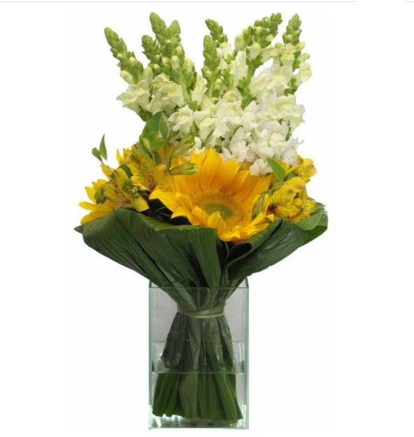 Lindo arranjo no estilo buquê feitos com maravilhosos girassóis e bocas de leão brancas acompanhando com um leve toque do delicada alstromérias, exuberante folhagem canoa, confeccionado na peça de vidro.