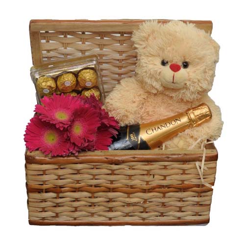 Baú de vime contendo um arranjo de gerberas cor de rosa ou elaborado em cores da época,para o presente ficar ainda mais elegante acompanha uma garrafa de chandon brut . uma caixa do delicioso bombom ferrero rocher com 12 unidades e uma pelúcia de aproximadamente 30 Cm.