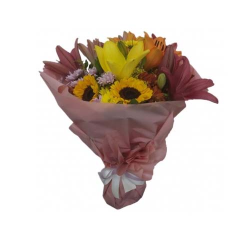 Bouquê de Flores do campo misto com lrios,astromérias,margaridas acabamento envouta de folhagem canoa, embaldo para presente no tradicional celofane transparênte e laço de cetim ou ráfia.