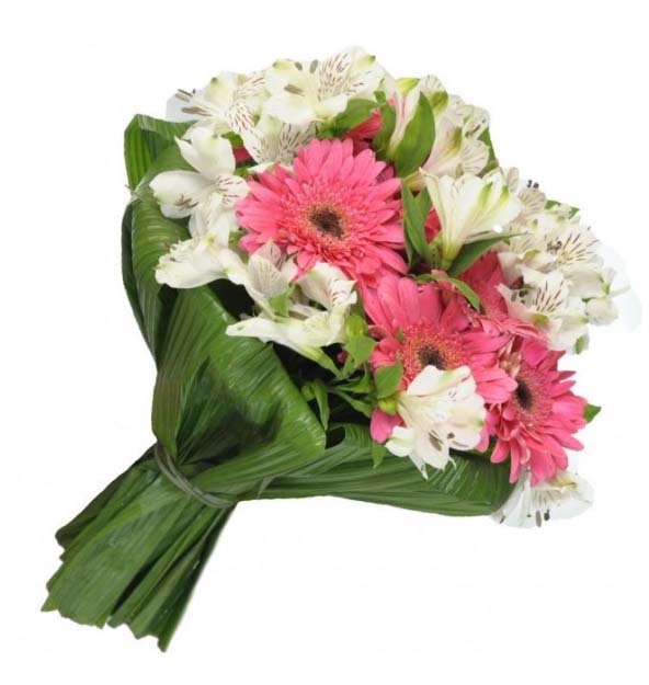 Lindo buquê contendo 9 gerberas cor de rosa ou em cores da época e um toque especial de alstromérias,trabalhado com folhagem canoa,embalado no tradicional celofane transparente acompanha Um lindo laço de cetim ou tecido especial.