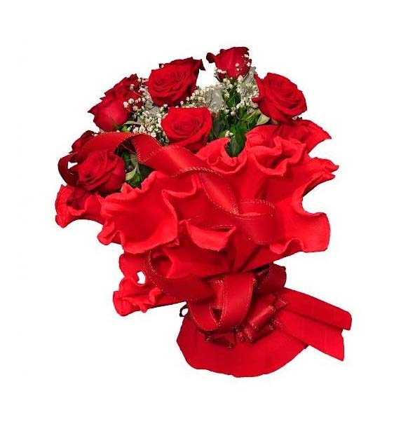 Lindo buquê especial no crepon, elaborado com 12 rosas vermelhas especiais,chuva de prata e folhagens,