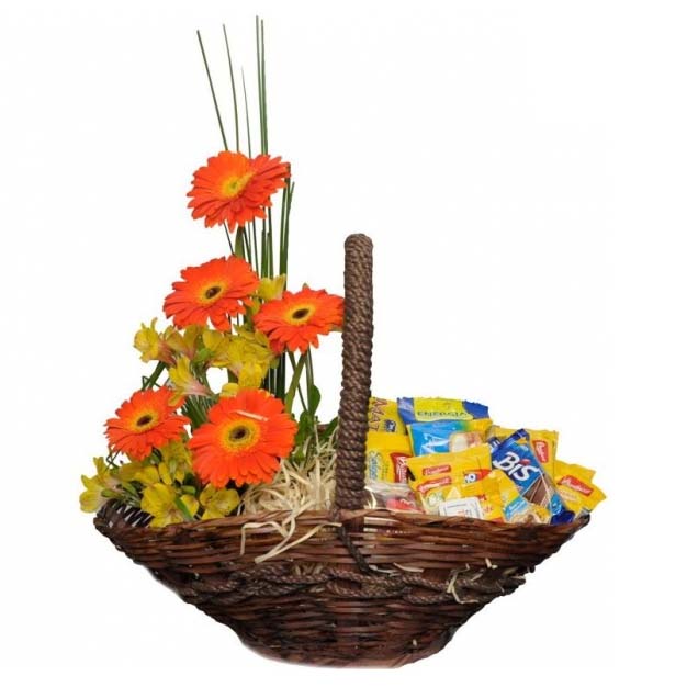 Cesta de café da manha ou da tarde, elaborada com um arranjo de gerberas e alstromérias amarelas ou em cores da época, confeccionada em uma linda cesta de vime e preparada com uma seleção dos melhores produtos e marcas,