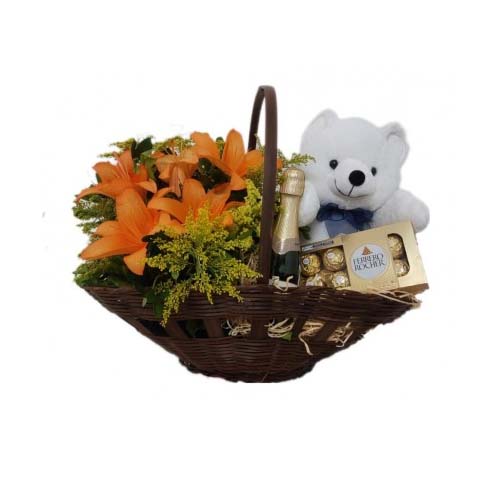 Surpreenda alguem em especial com nossa cesta exclusiva de lirios laranja, tango e folhagens para o presente ficar mas elegante acompanha uma garrafa de Chandon Baby de 187 Ml, uma caixa de chocolate da Ferrero Rocher de 8 unidades e uma pelucia de 30 cm de boa qualidade