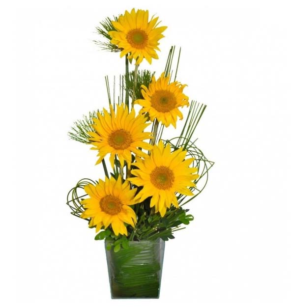 Lindo arranjo de girassóis contendo 10 flores, envolta acabamento de folhagem canoa na peça de vidro,acompanha um lindo laço de cetim ou tecido especial.