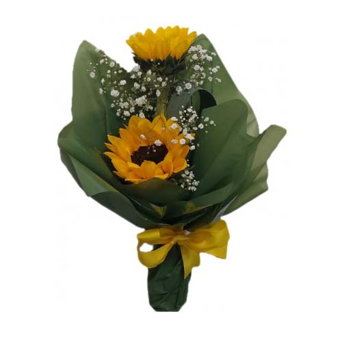 Lindo buque contendo 2 girassois, chuva de prata
