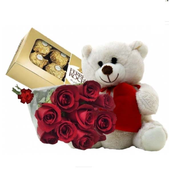 Kit Amore, Contendo 6 Rosas Vermelhas,1 Peluçia de 20Cm e 1 Caixa do delicioso Ferrero Rocher de 8 Unidades.