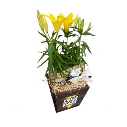 Lírio Amarelo ou Laranja Plantado, Embalado Para Presente Elaborado em Uma Caixa de Madeira Rustica Com Frase “Feliz dia dos Pais”
