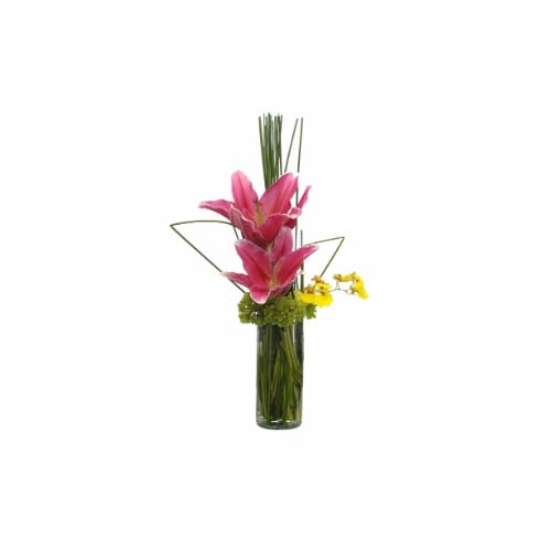 Lindo arranjo elaborado com uma seleção de flores finas, lirios ,astromérias e um toque especial de orquidea oncydium, acabamento com junco,