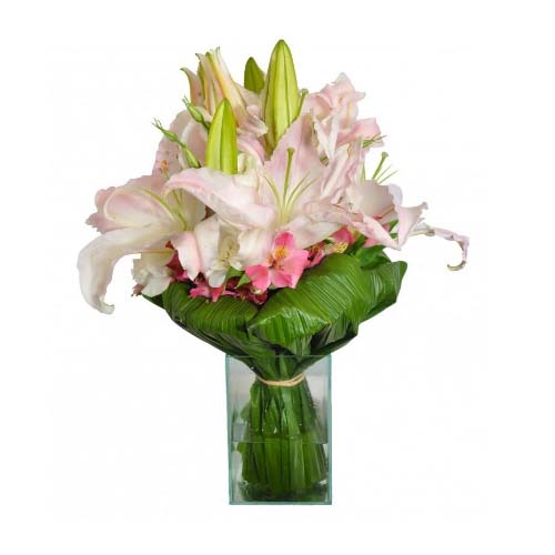 Arranjo de lírios cor de rosa,junco e alstromérias, elaborado em um vaso de vidro retangular acompanha um lindo laço de cetim,