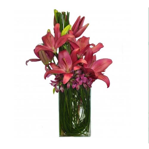 Arranjo de lirios rosa,astromérias,gerberas e junco na peça de vidro alto, acompanha um lindo laço de cetim combinando com as flores.