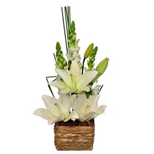 Arranjo de lírios médio branco, contendo alstromérias,lizianthus,gerberas,. acabamento envouta de folhagem canoa , acompanha um lindo laço de cetim ou tecido especial.