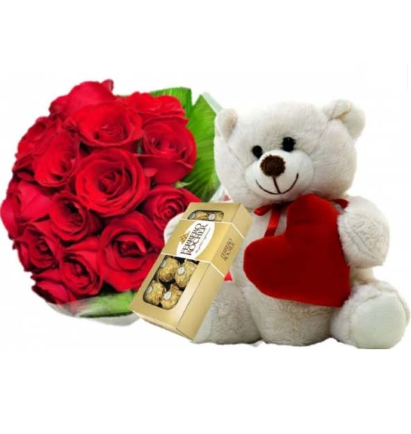 Mozão, Contendo 12 Rosas Colombianas de 1º Qualidade Acompanhado de Uma linda Peluçia de 20Cm e 1 Caixa do Delicioso Ferrero Rocher de 8 Unidades.